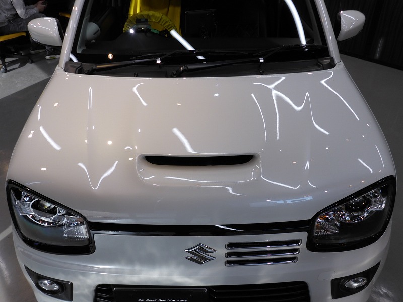 H様 スズキ アルトワークス ボディー磨き作業です。 塗装後の状態ですが細かなスクラッチキズやシミが見られました。 磨き作業後、保護材を施工しました。 R4 2022.2.23