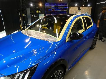 K様 プジョー 208 ボディーコーティング、窓ガラス撥水加工及びフィルム施工作業です。