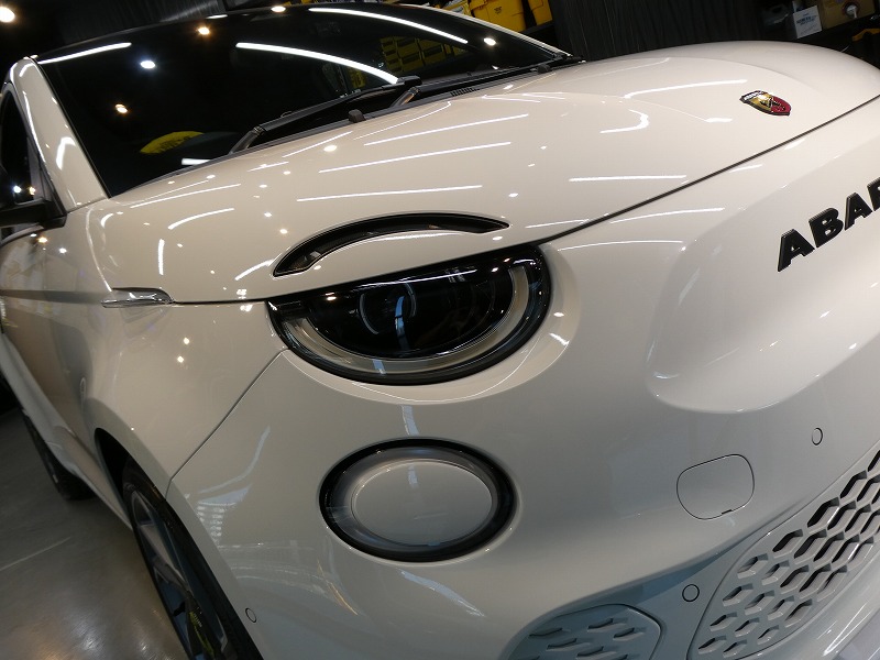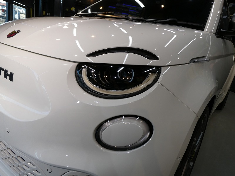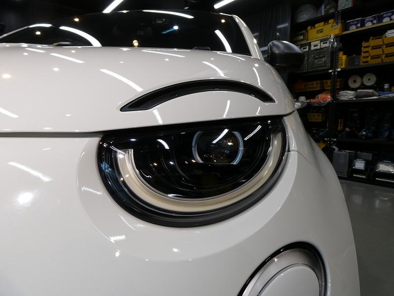 H様 アバルト 500e 新車 ヘッドライトプロテクションフィルム施工作業です。