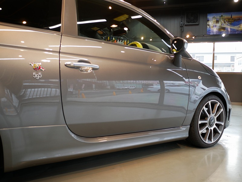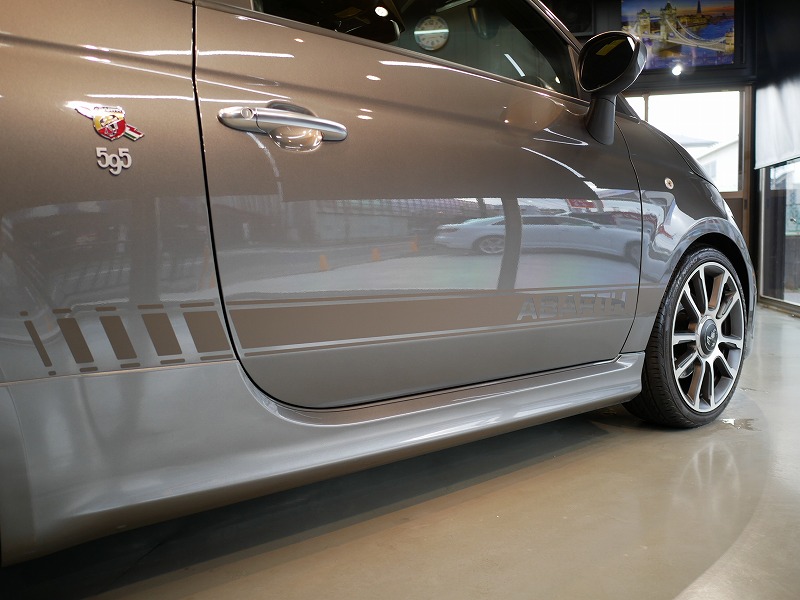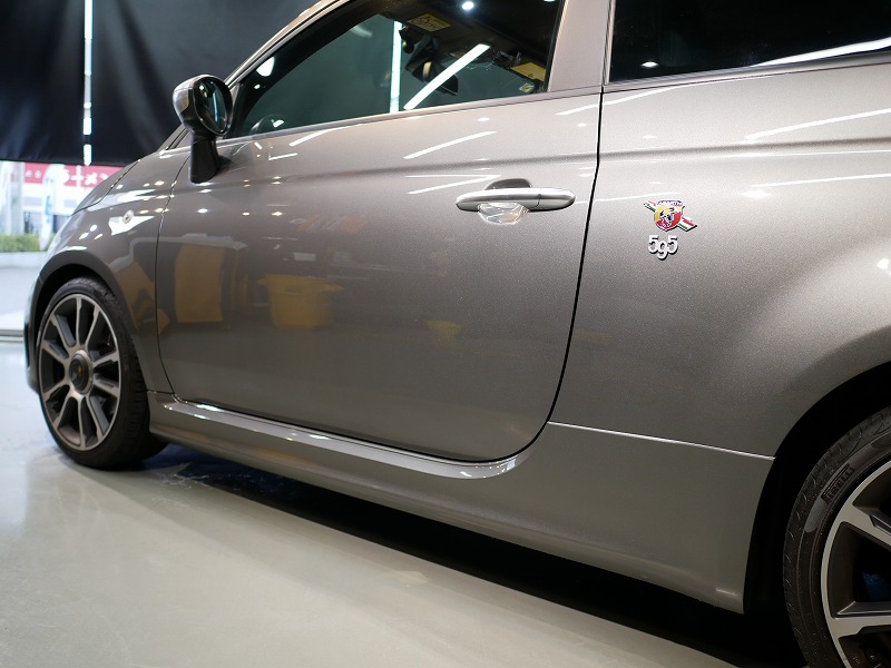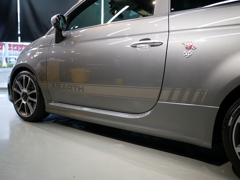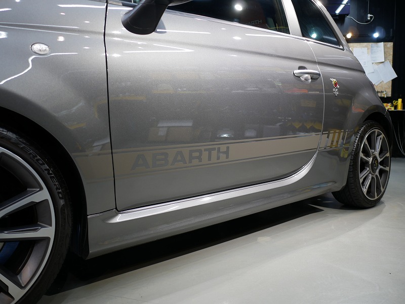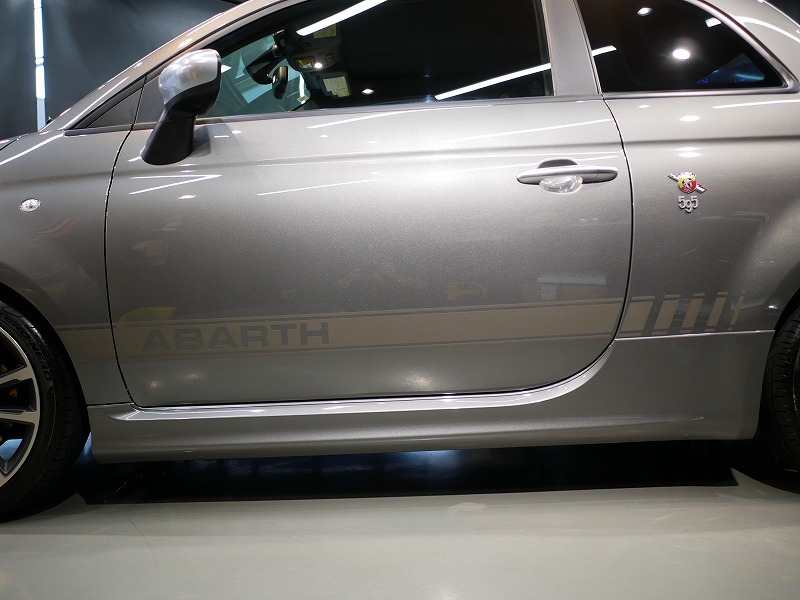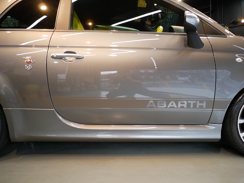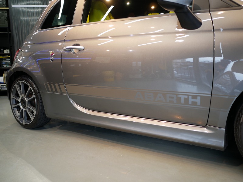 K様 アバルト 595 サイドデカー施工作業です。