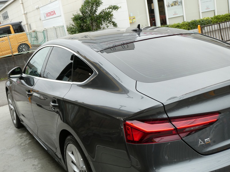 アウディ A5(F5)フィルム施工作業です。 リア5面には既にフィルムが施工してありましたがその上からシルフィード SC−7015を施工しました。 ○参考施工価格(税別)正確な金額はお手数ですが、お見積もりをお願い致します。 アウディ A5 リア5面フィルム施工 ルミクール施工 ¥45,000 シルフィード施工 ¥58,500 R7 2025.10.21